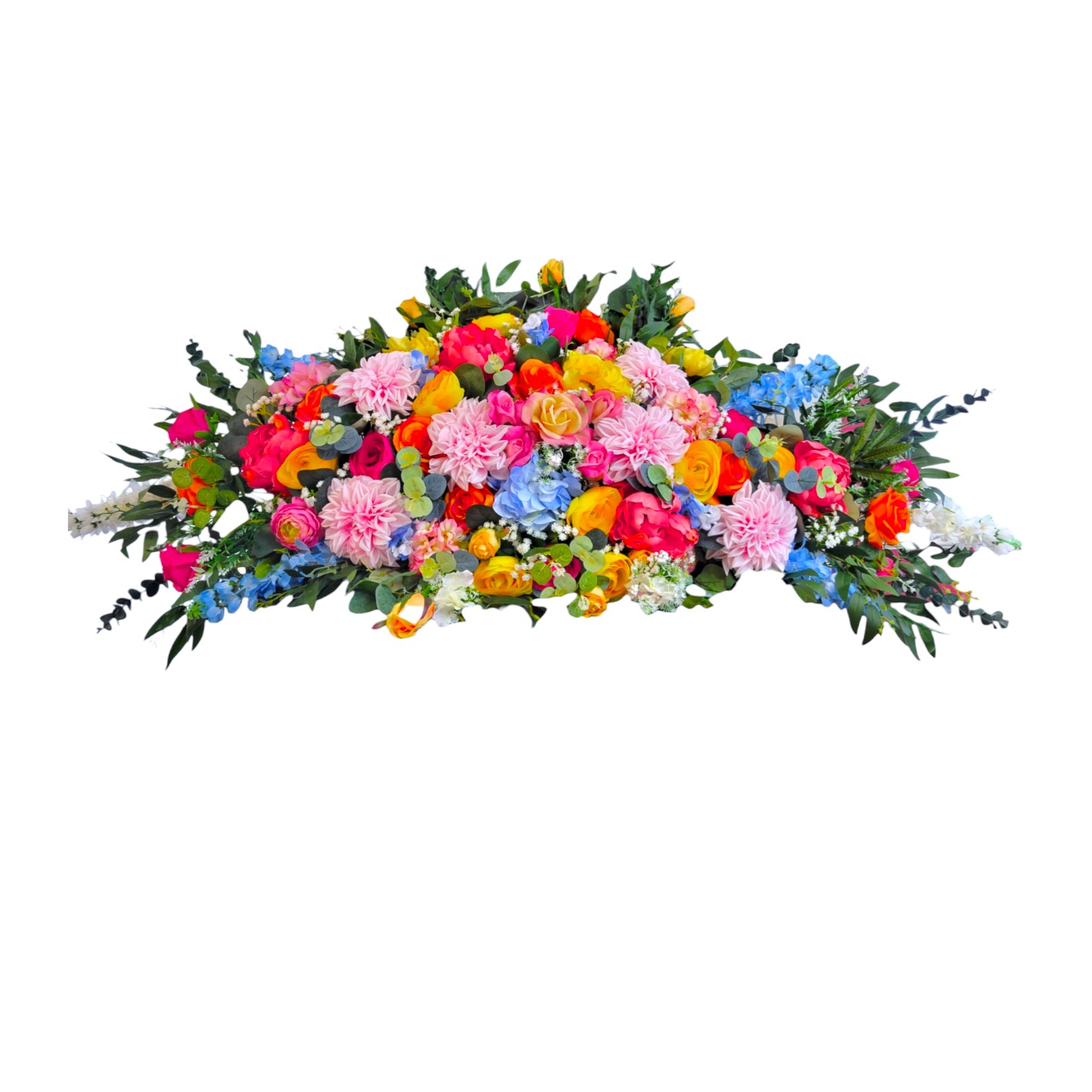 This floral arrangement is a classic mix of roses, hydrangeas, ranunculuses, dahlias, and eucalyptus. It measures over 5 feet long and 2.5 feet wide.